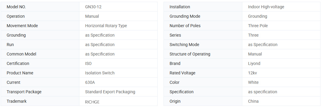 ตัวตัดการเชื่อมต่อไฟฟ้าแรงสูงแบบหมุนในร่ม GN30-12 เป็นชนิดใหม่พร้อมมีดหมุน สูตรโครงสร้างหลักคือการยึดฉนวนและหน้าสัมผัสสองชุดบนระนาบบนและล่างของเฟรมต่ำทั่วไปแบบสามเฟส เพื่อให้เกิดการเปิดและปิดสวิตช์โดยการหมุนมีด สวิตช์ GN3-12D เพิ่มรูปแบบการเชื่อมต่อมีดบนพื้นฐานของ GN30-12 เพื่อตอบสนองความต้องการของระบบไฟฟ้าที่แตกต่างกัน สินค้านี้มีดีไซน์กะทัดรัด พื้นที่ขนาดเล็ก ฉนวนแข็งแรง ติดตั้งและปรับแต่งได้ง่าย เป็นไปตามข้อกำหนดของ "สวิตช์แยกไฟฟ้าแรงสูง AC และสวิตช์สายดิน" และใช้ได้กับระบบภายในอาคารที่มีแรงดันไฟฟ้าสูงสุด 10 KV AC 50 Hz และต่ำกว่า สามารถใช้เป็นวงจรเปิดปิดได้เมื่อมีแรงดันไฟฟ้าและไม่มีโหลด สามารถใช้กับสวิตช์เกียร์ไฟฟ้าแรงสูงหรือจะใช้เดี่ยวก็ได้