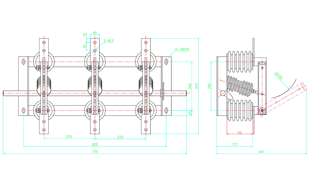 - สวิตช์แยกเสาเดี่ยว: ใช้พื้นที่แนวตั้งใต้บัสบาร์เหนือศีรษะโดยตรงเป็นฉนวนไฟฟ้า ประหยัดพื้นที่ ลดตัวนำที่เชื่อมต่อ และให้สถานะการตัดการเชื่อมต่อที่ชัดเจน เหมาะอย่างยิ่งสำหรับการส่งไฟฟ้าแรงสูงพิเศษ