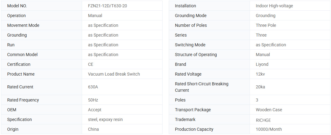 FZN21-12D/T630-20 สวิตช์สูญญากาศแรงดันไฟฟ้าแรงดันสูงในร่มซึ่งเหมาะสำหรับเครือข่าย PowerSupply ที่มีแรงดันไฟฟ้า 10kV AC 50Hz สามเฟสใช้สำหรับทำลายกระแสโหลด